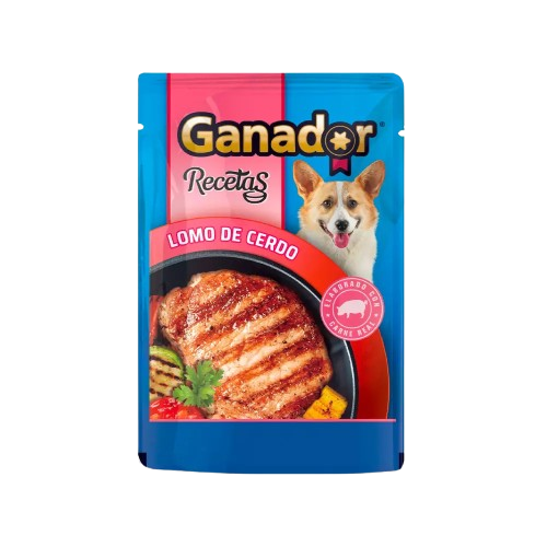 Alimento Ganador húmedo sabor cerdo para perros. Alimento húmedo formulado para perros aporta proteína animal sabor intenso alta palatabilidad hidratación adicional fácil consumo complemento diario ideal para mezclar con croquetas mejorar apetito variar dieta hogares responsables práctico confiable económico accesible constante. Beneficios: ✔Alta palatabilidad, ✔Sabor cerdo atractivo, ✔Fácil consumo diario, ✔Complemento nutricional, ✔Mejora apetito. Presentación: 22 sobres de 100gr.