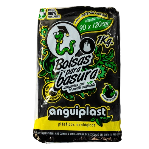 Bolsa negra Anguiplast resistente para manejo de residuos pesados. Bolsa plástica de gran tamaño ideal para recolección basura industrial comercial y doméstica soporta peso considerable uso frecuente en negocios talleres limpieza general manejo seguro práctico confiable constante. Beneficios: ✔Alta resistencia, ✔Gran capacidad, ✔Uso intensivo, ✔Material durable, ✔Manejo seguro. Presentación: 25 kg medida 90x120cm