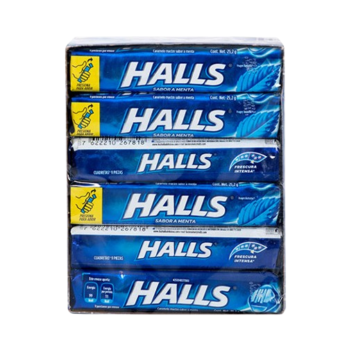 Pastillas Halls sabor Menta, ideales para refrescar el aliento y brindar sensación de alivio en la garganta. Su sabor clásico y refrescante las hace de alta rotación. Presentación en display para fácil exhibición en mostrador. Beneficios: ✔Sabor menta refrescante, ✔Sensación de alivio para la garganta, ✔Ideal para consumo diario, ✔Marca reconocida y confiable. Presentación: 30 displays/12 piezas.