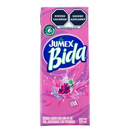 Bebida Jumex Bida sabor uva, con un sabor frutal dulce y agradable, ideal para acompañar comidas. Su presentación de 237 ml es práctica, perfecta para venta en abarrotes. Beneficios: ✔Sabor uva dulce y agradable, ✔Presentación individual práctica, ✔Listo para beber, ✔Ideal para consumo diario, ✔Alta rotación en punto de venta. Presentación: Caja con 24 envases de 237ml.