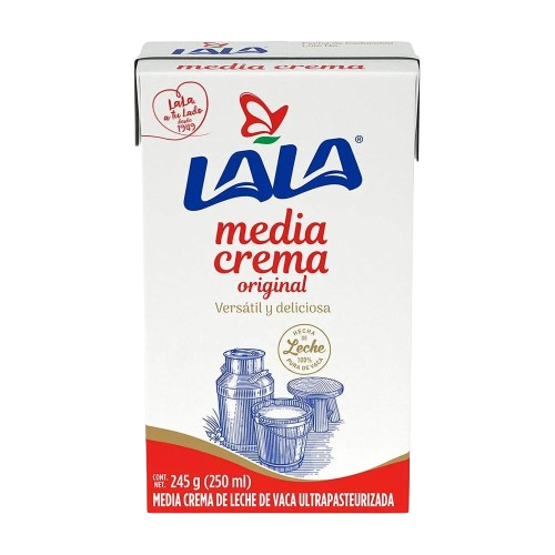 Media crema Lala de textura cremosa y sabor suave, ideal para cocina dulce y salada. Perfecta para sopas, pastas, salsas, postres y bebidas, con excelente rendimiento tanto para el hogar como para food service. Beneficios: ✔Textura cremosa y fácil de integrar, ✔Sabor balanceado, ✔Ideal para recetas dulces y saladas, ✔Excelente rendimiento, ✔Marca mexicana reconocida. Presentación: 27 piezas de 250ml.