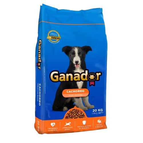 Alimento Ganador cachorro completo para crecimiento saludable. Formulado para cachorros aporta proteínas energía vitaminas minerales digestión adecuada desarrollo óseo muscular defensas fuertes aprendizaje activo crecimiento equilibrado sabor agradable croquetas fáciles consumo diario hogares criadores responsables confiable práctico económico estable constante. Beneficios: ✔Nutrición balanceada diaria, ✔Crecimiento sano constante, ✔Alta digestibilidad comprobada, ✔Energía diaria sostenida, ✔Buen sabor agradable. Presentación: 20kg.