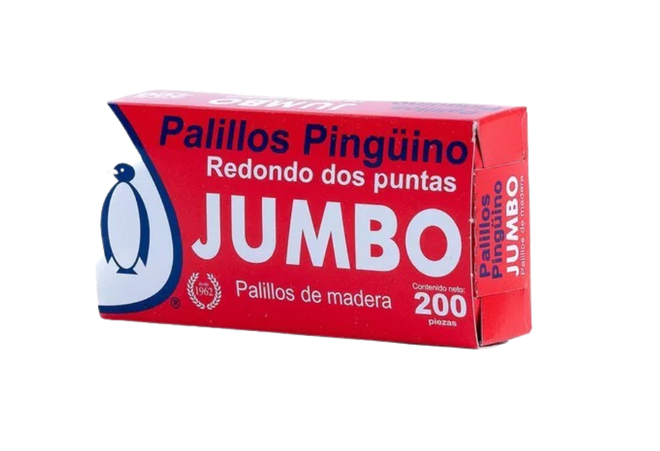 Palillos Pingüinos Jumbo de madera resistente, ideales para elotes, brochetas, botanas y antojitos. Su tamaño jumbo brinda mayor firmeza y comodidad, con presentación para fácil manejo y exhibición. Beneficios: ✔Tamaño jumbo para mayor resistencia, ✔De buena calidad, ✔Presentación higiénica en frasco, ✔Ideal para elotes y brochetas, ✔Excelente rendimiento. Presentación: 10 exhibidores con 10 frascos de 200 piezas.