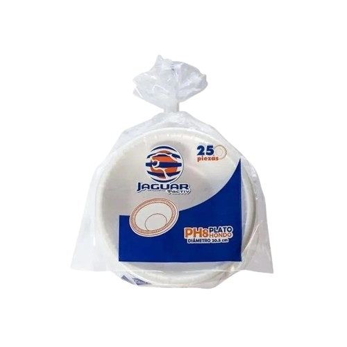 Plato pozolero Jaguar PH8, fabricado en material resistente y de mayor capacidad, ideal para pozole, sopas, caldos y guisos. Es práctico, durable y de alta rotación.  Beneficios: ✔Mayor capacidad, ideal para pozole, ✔Ideal para uso comercial y doméstico, ✔Fácil de lavar y reutilizar, ✔Material resistente y durable, ✔Presentación rendidora para mayoreo. Presentación: Paquete con 20 bolsas de 25 piezas.