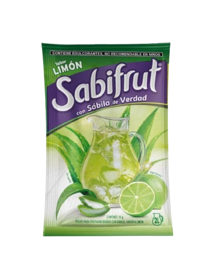 Bebida en polvo Sabifrut Sábila Limón. La combinación de sábila con limón ofrece un sabor cítrico y ligero. Presentación en sobres individuales para mejor dosificación y venta. Beneficios: ✔Preparación rápida y sencilla, ✔Sabor cítrico refrescante de limón con sábila, ✔Presentación en exhibidor de alta rotación, ✔Ideal para tiendas y abarrotes. Presentación: 12 exhibidores con 8 sobres de 15gr.