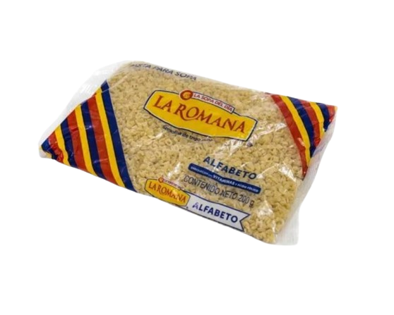 La Sopa Alfabeto La Romana es una pasta tradicional y rendidora, ideal para preparar sopas caseras y caldos de manera práctica. Su forma de letras la hace atractiva siendo un producto de alta rotación. Beneficios: ✔Fácil y rápida de preparar, ✔Presentación económica, ✔Producto básico de alta rotación, ✔Marca confiable. Presentación: 20 bolsas de 200gr.
